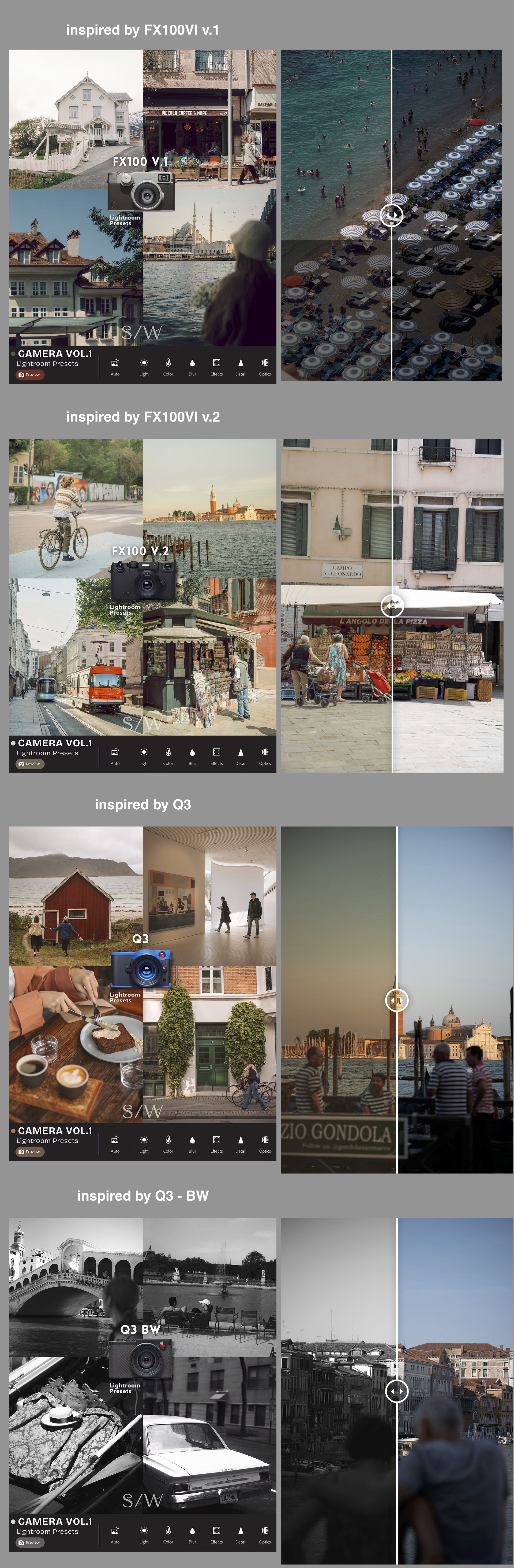 2023-2024年受经典相机启发的7款全新Lightroom预设。每款相机都拥有独特风格,其最终呈现效果取决于摄影师的设置与拍摄方式。 我们以这些传奇相机系列的色彩特质为灵感,匠心打造出独具特色的全新预设套装。